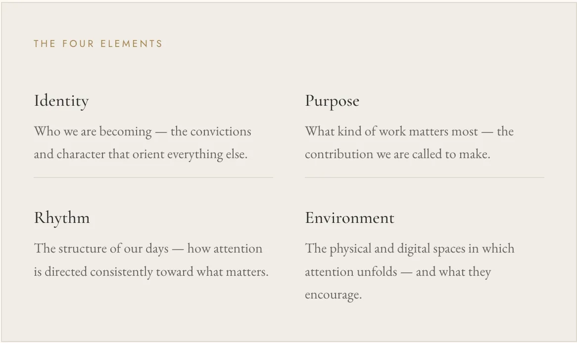 Alignment begins with a different set of questions. Not how do I get more done, but who am I becoming? Not how do I optimize my calendar, but what kind of work deserves my deepest attention? Not how do I eliminate distraction, but what environments support clarity rather than scatter it?